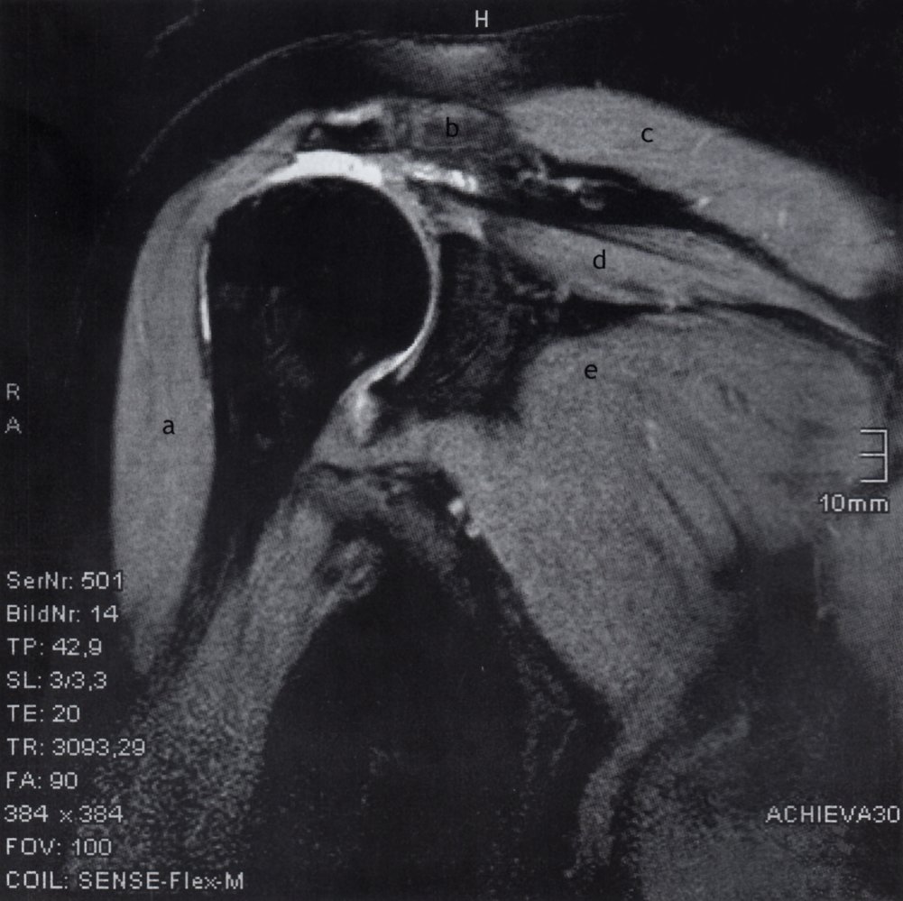 - Most commonly the rotator cuff (supraspinatus or infraspinatus tendons)