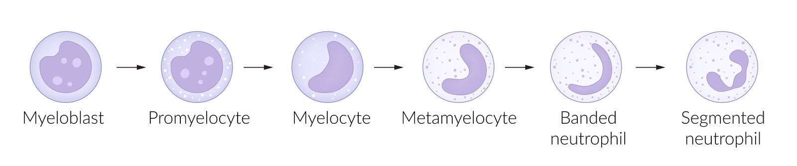 - Myeloid precursor cells develop into erythrocytes, granulocytes, or megakaryocytes.
