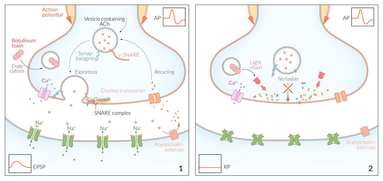 Botulinum neurotoxin (a protease) cleaves SNARE proteins β prevention of neurotransmitter-containing vesicles fusing with the presynaptic membrane β inhibition of acetylcholine release from the presynaptic axon terminals β flaccid muscle paralysis