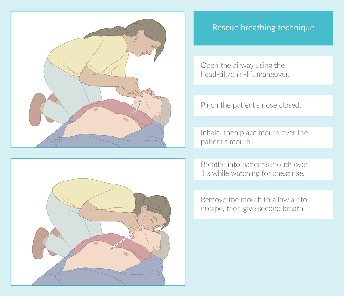 - Breathe slowly into the patient's mouth for βΌ 1 second; check for chest rise to confirm sufficient ventilation.