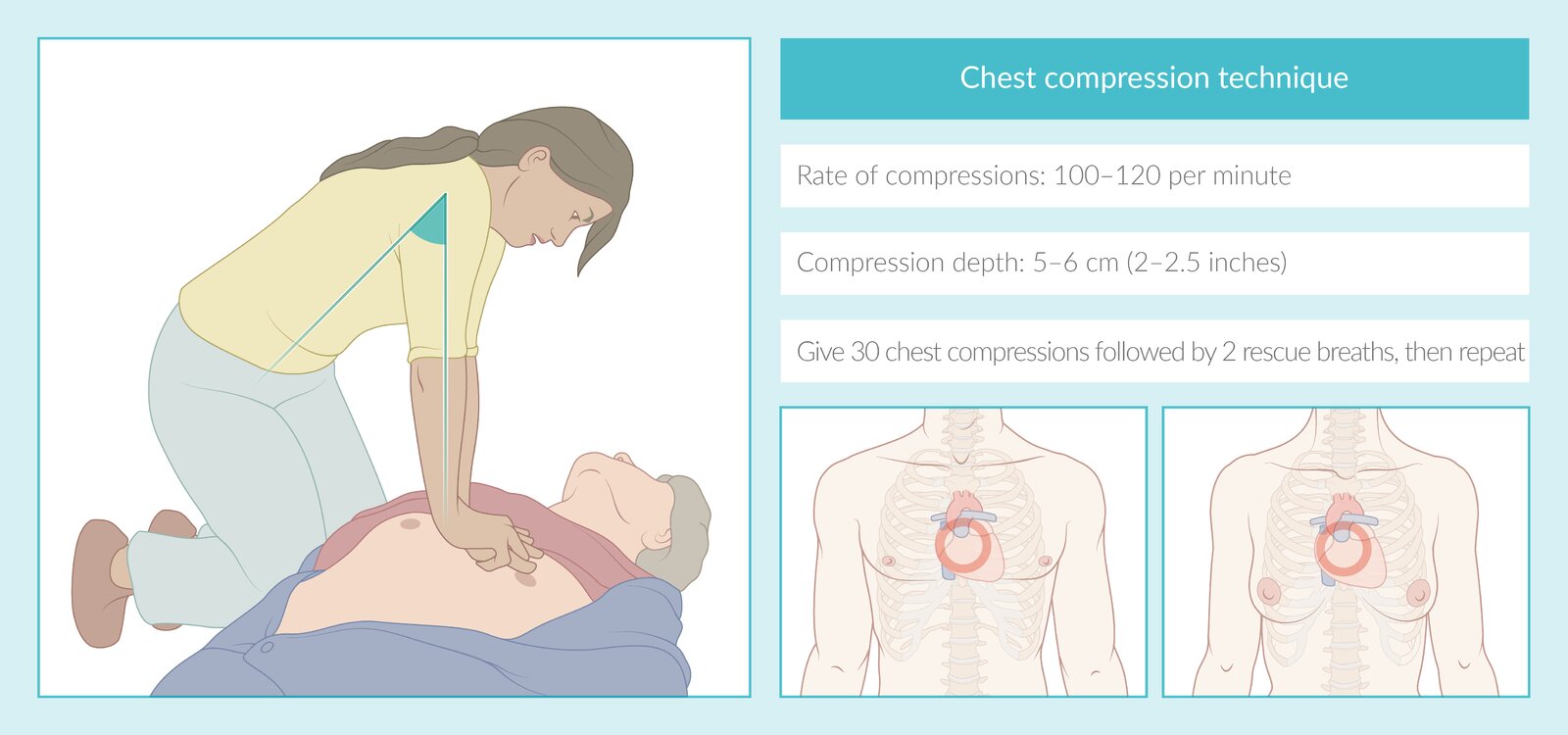 For sudden cardiac arrest, use the CAB approach to begin chest compression as soon as possible.