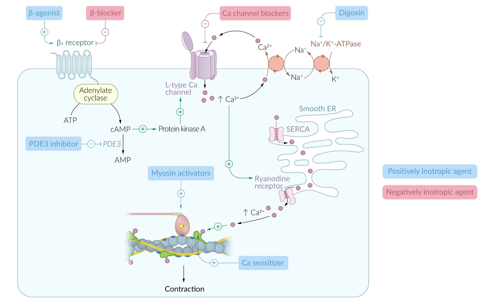 Inhibition of Na+/K+-ATPase → higher intracellular Na+ concentration → reduced efficacy of Na+/Ca2+ exchangers → higher intracellular Ca2+ concentration