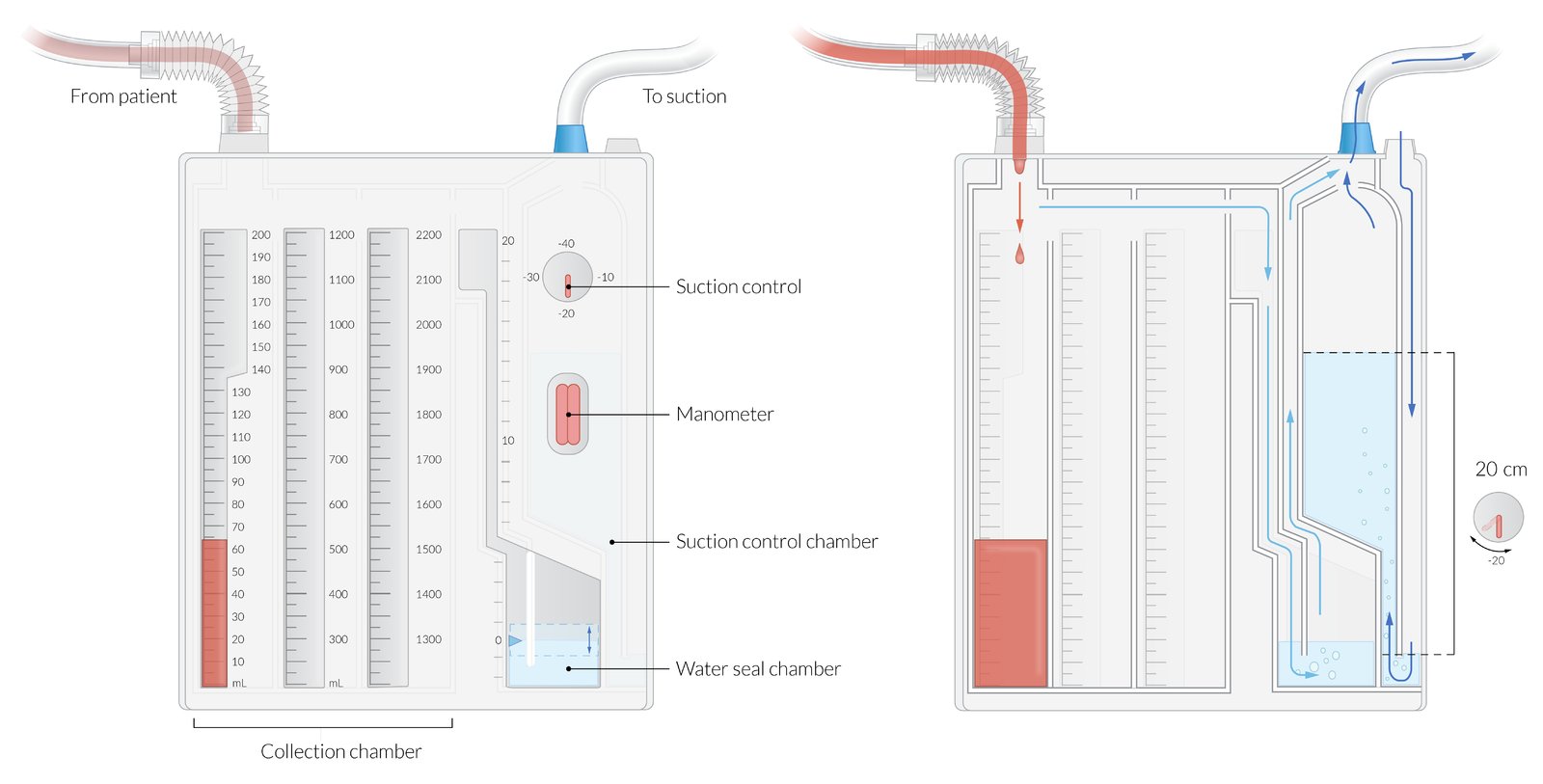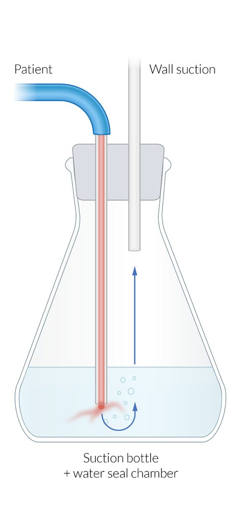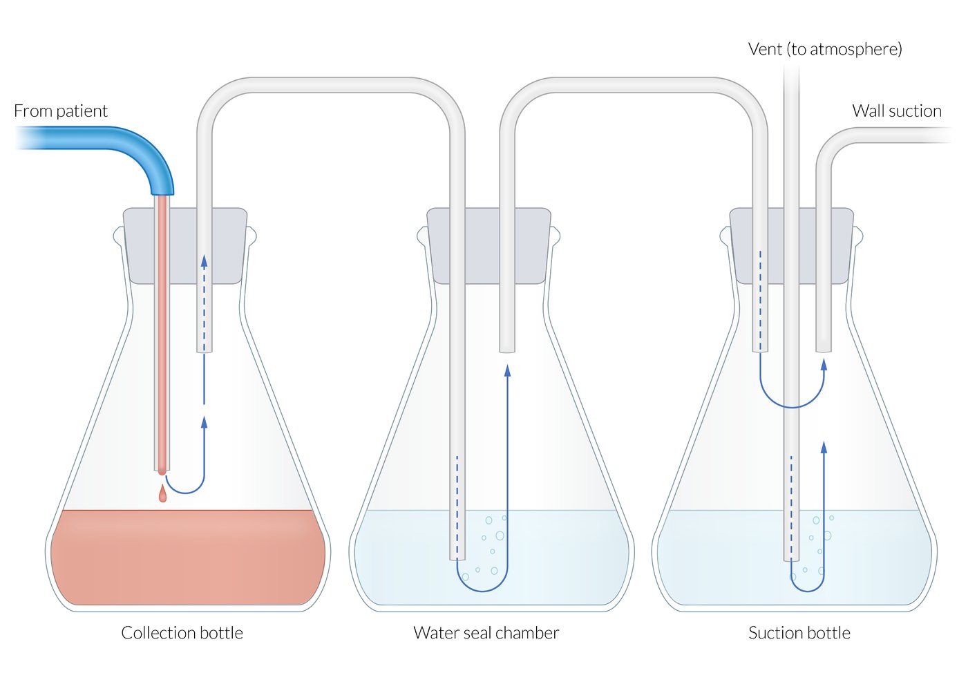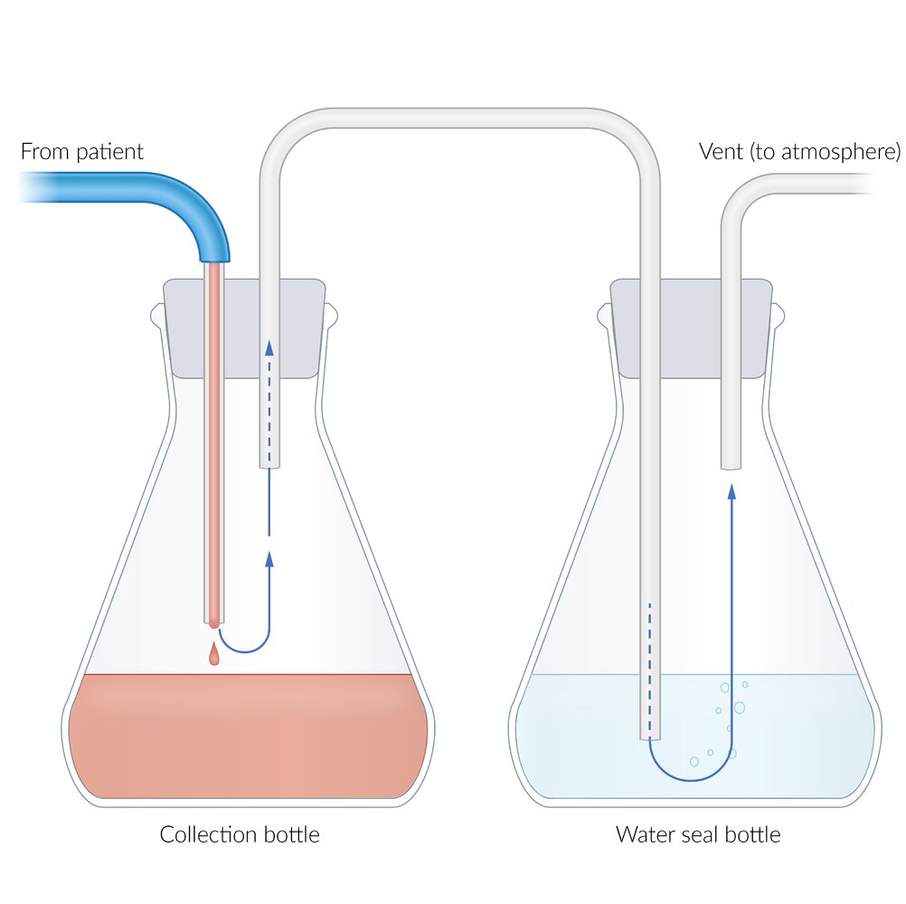 - Positioning: below the level of the chest to prevent backflow from the collection chamber