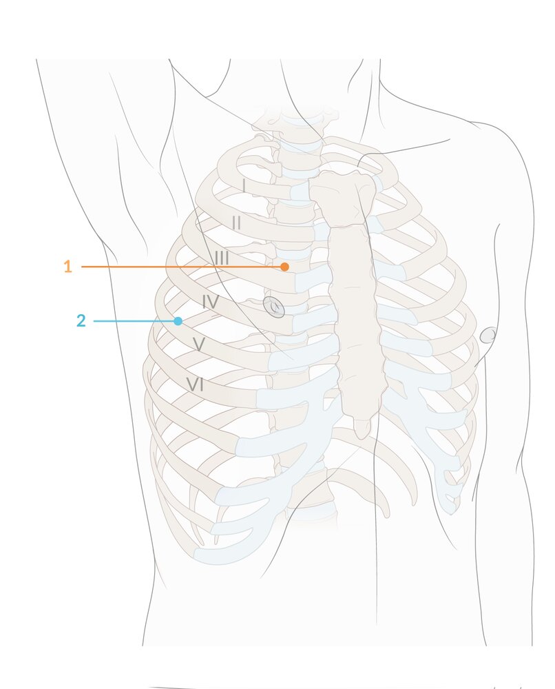 - 4th or 5th intercostal space: approximately at the level of the nipple for men and above the inframammary fold for women