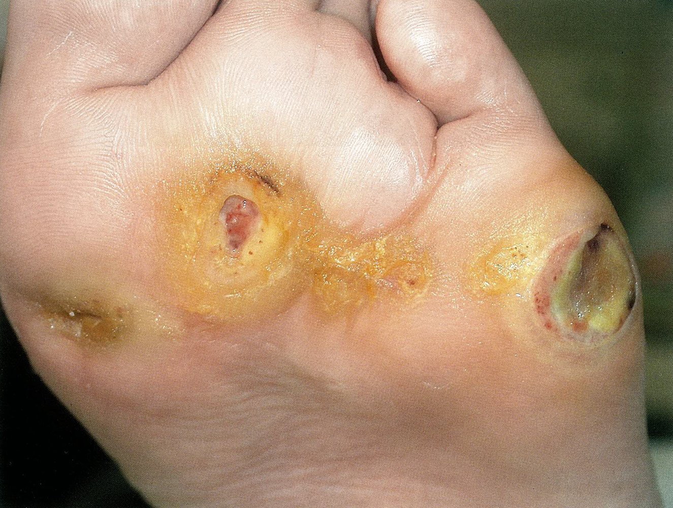 - Ischemic ulcers: due to PAD and microvascular changes [5]