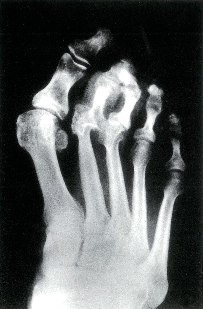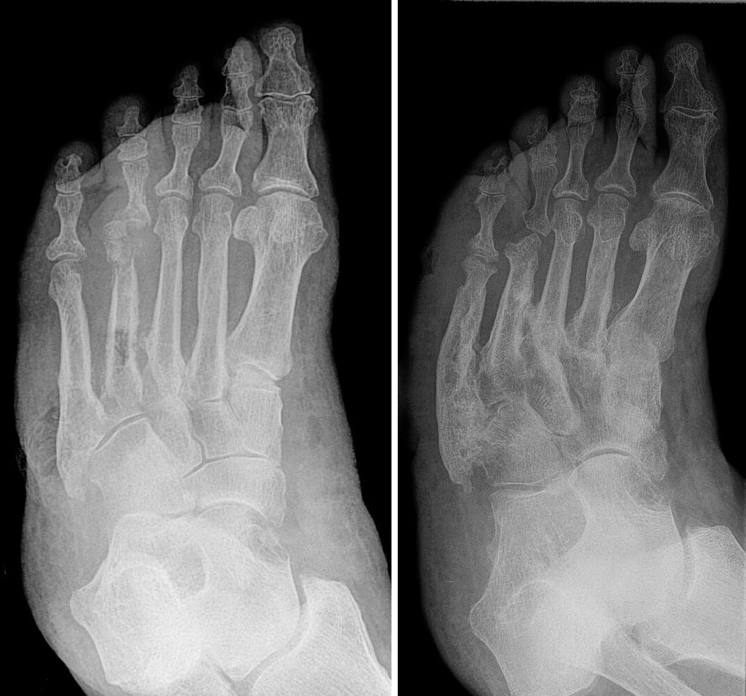 - Chronic stage: painless bony deformities, midfoot collapse (rocker-bottom foot deformity), osteolysis, fractures