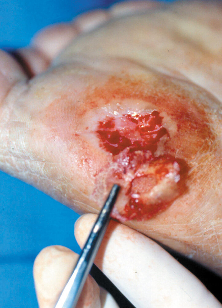 - Debridement (e.g., surgical) including removal of surrounding calluses, if present