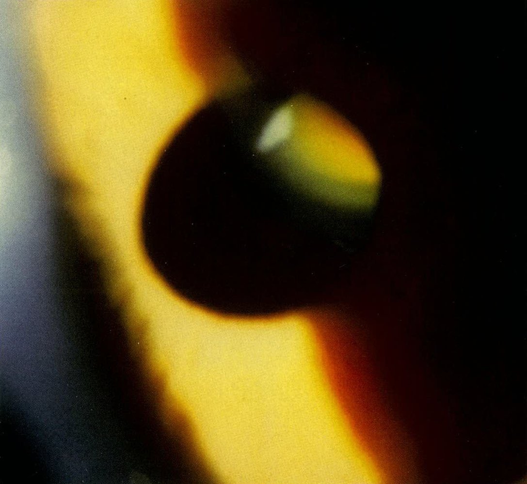 - Pseudoexfoliation syndrome (mean age of onset is 69–75 years): deposition of fibrillary residue from the lens and iris onto the lens capsule, ciliary body, zonules, iris, and corneal endothelium