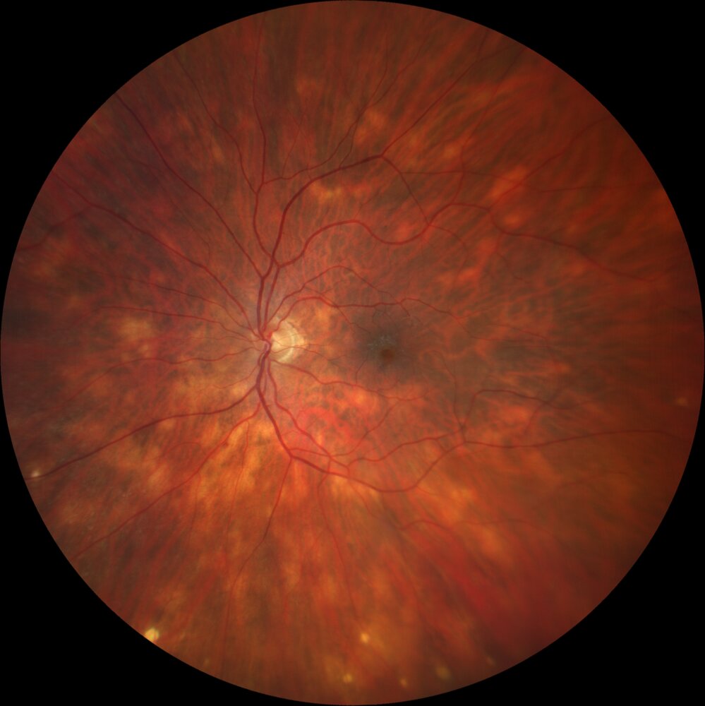 - Chronic stage: sunset-glow fundus (orange-red discoloration of the choroid due to inflammatory depigmentation).