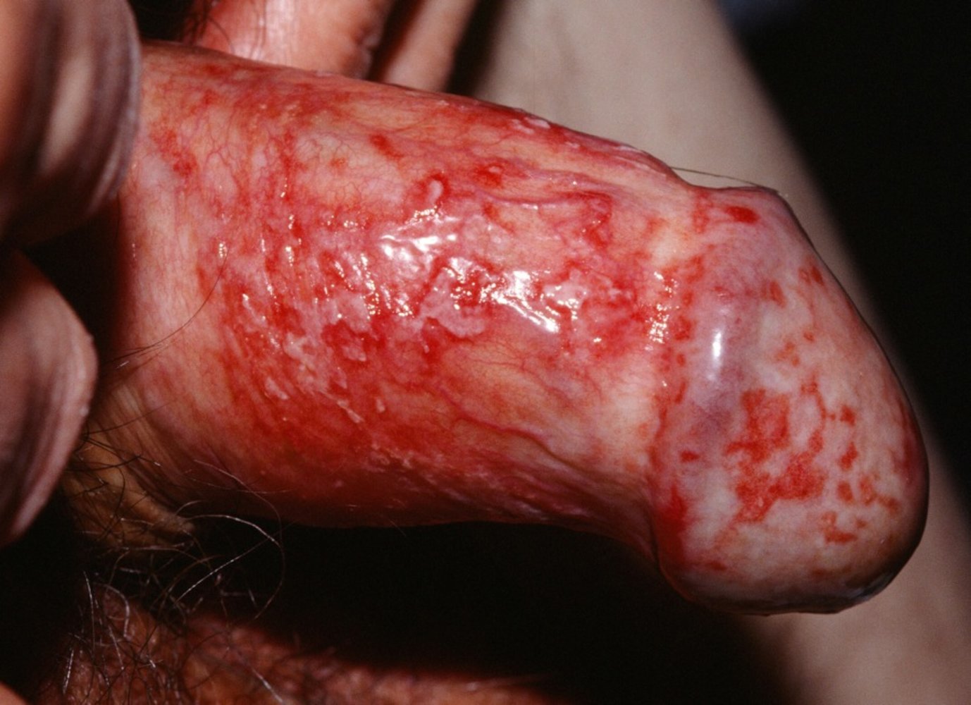 - Erythema of the glans and/or foreskin with possible erosions or ulcerative lesions