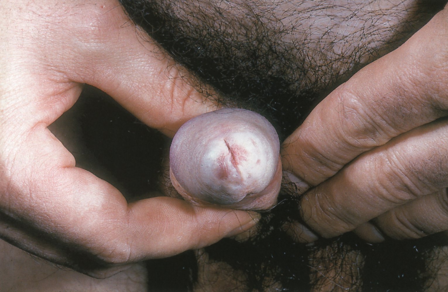 - Perform reduction by pressing on the glans with two thumbs while pulling the foreskin over the glans.