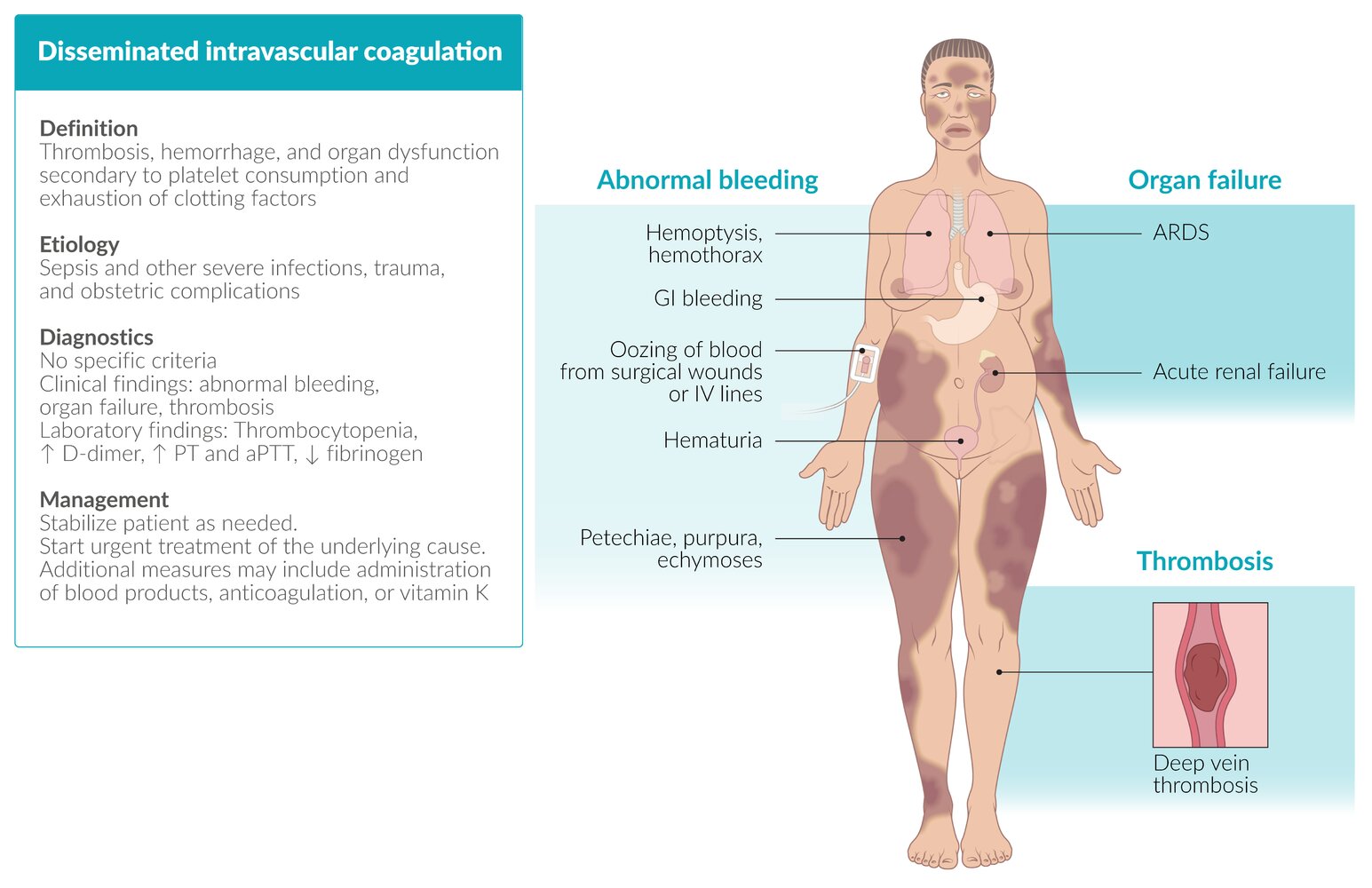 Disseminated intravascular coagulation (DIC) is a disorder characterized by systemic activation of the extrinsic clotting cascade with microthrombi formation, platelet consumption, and subsequent exhaustion of all clotting factors. Common causes of DIC include sepsis, trauma, and malignancy. Depending on the underlying pathophysiological processes and subtype, patients present with signs of bleeding (e.g., purpura, petechiae, ecchymoses) and/or multiorgan failure. Laboratory studies can be highly variable. However, typical findings in overt decompensated DIC include thrombocytopenia, prolonged PT and aPTT, decreased fibrinogen levels, and elevated D-dimer levels. Treatment involves identification of the underlying cause and supportive therapy with transfusions of blood products (pRBCs, platelet concentrates, FFP, and/or cryoprecipitate) and, in select cases, anticoagulants (e.g., heparin) or antifibrinolytic therapy (tranexamic acid). Close monitoring and specialist consultation (e.g., critical care and hematology) are typically required.