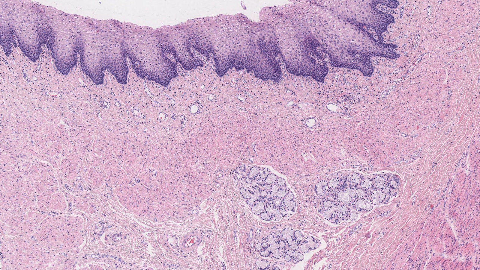 - Contains blood vessels, Meissner's plexus, and glandular epithelium