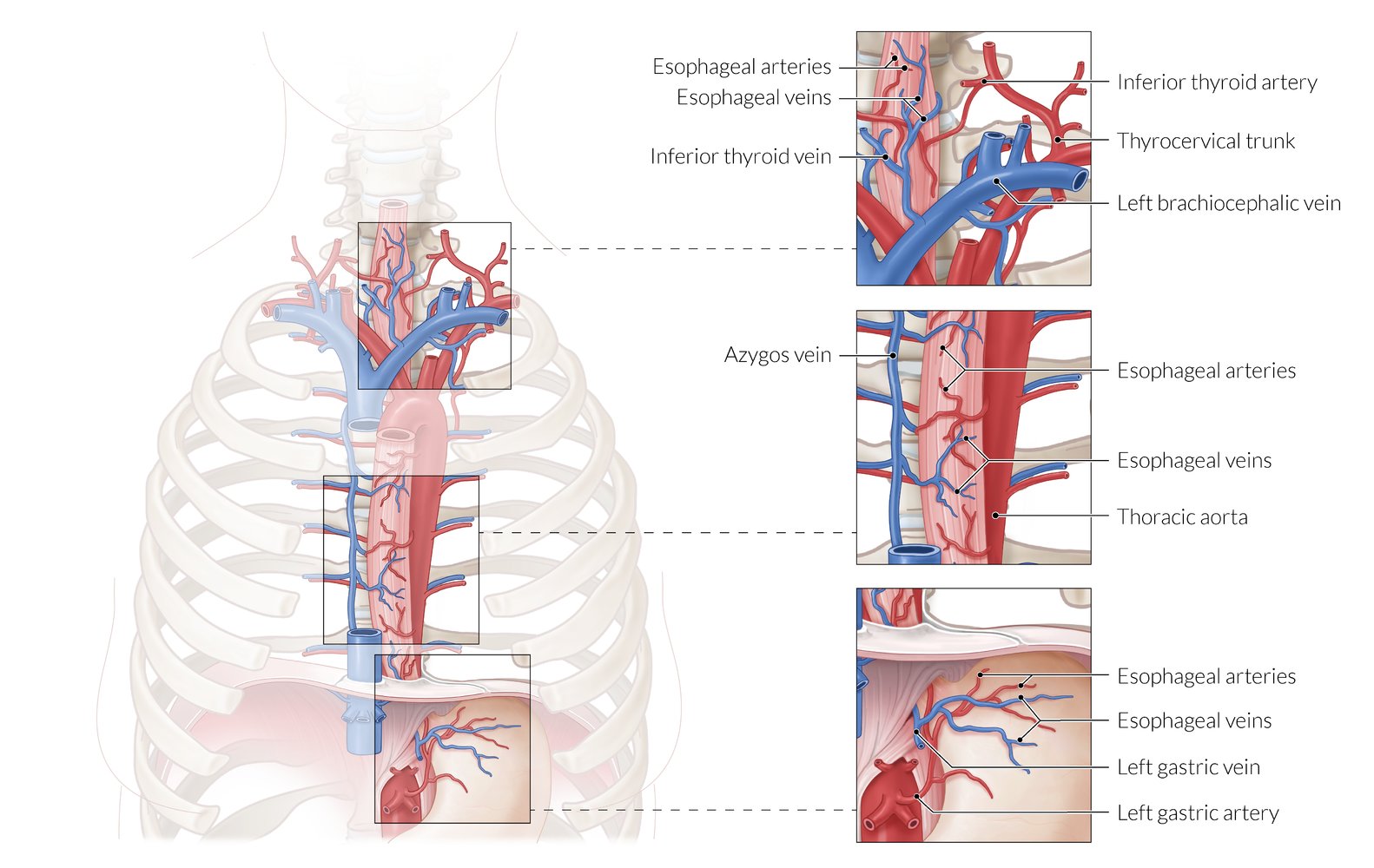 The esophagus is the muscular tube derived from the foregut that carries food and liquid from the oropharynx to the stomach. It crosses the diaphragm at the esophageal hiatus, which is located at the level of the tenth thoracic vertebra (T10). The esophagus has an upper sphincter, which prevents the entry of air, and a lower sphincter, which prevents the reflux of gastric acid. Food is transported by peristaltic movements of the esophageal muscles. The esophagus is supplied by the esophageal branches of the inferior thyroid artery, the thoracic aorta, and the left gastric arteries. The veins of the esophagus drain into the systemic circulation via the azygos and the hemiazygos veins and into the portal circulation via the left gastric veins. Portal hypertension results in esophageal varices, which are supplied by the left gastric veins. The esophageal wall consists of four concentric layers: mucosal, submucosal, muscular, and adventitia. The mucosa is lined by nonkeratinizing stratified squamous epithelium that transitions to columnar epithelium at the gastroesophageal junction. In gastroesophageal reflux disease (GERD), chronic acid exposure induces metaplasia of the lower esophageal squamous epithelium to gastric columnar epithelium (Barrett esophagus). Other diseases that may affect the esophagus include esophageal stricture, esophageal atresia, achalasia, and esophageal cancer.