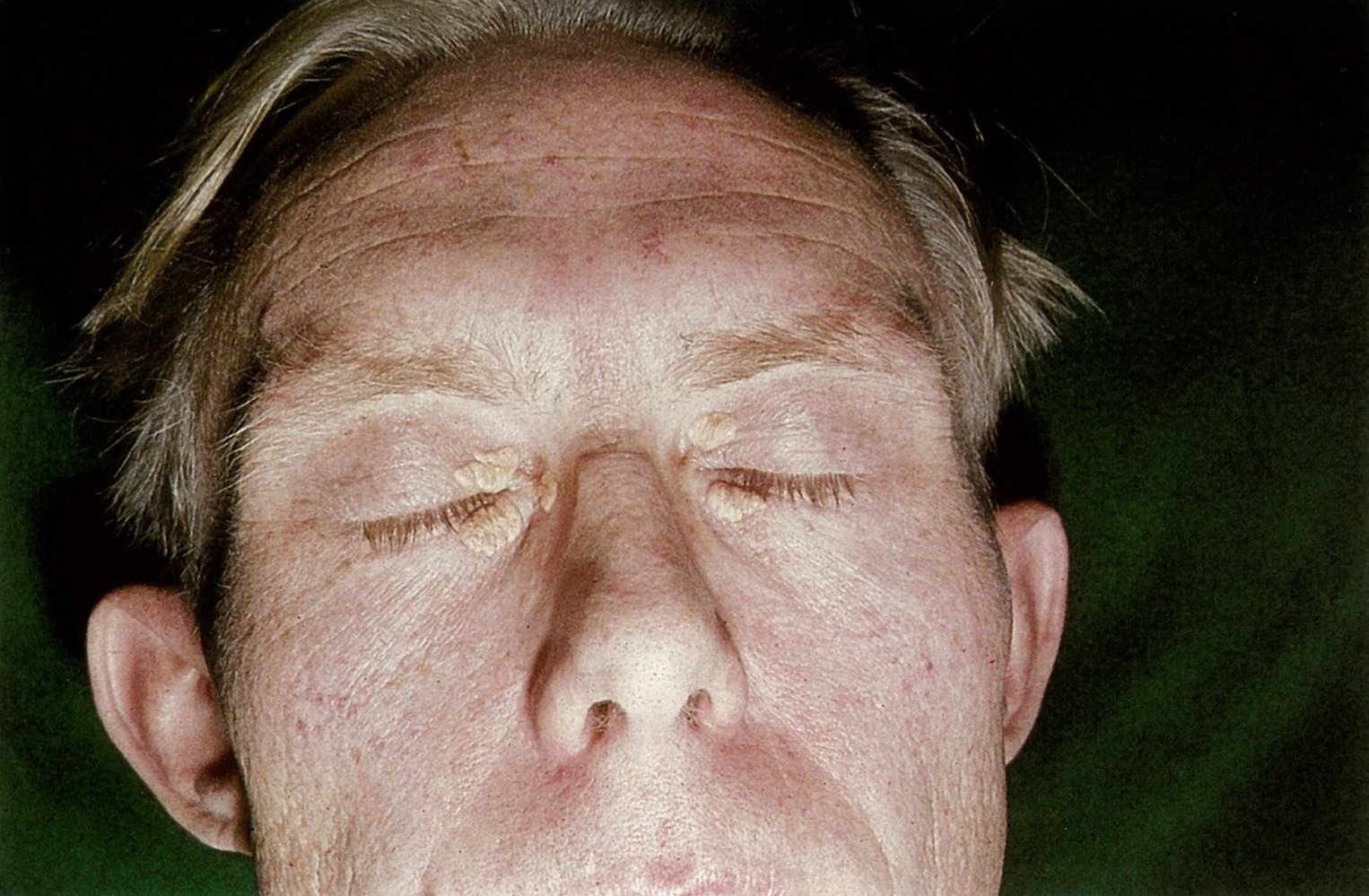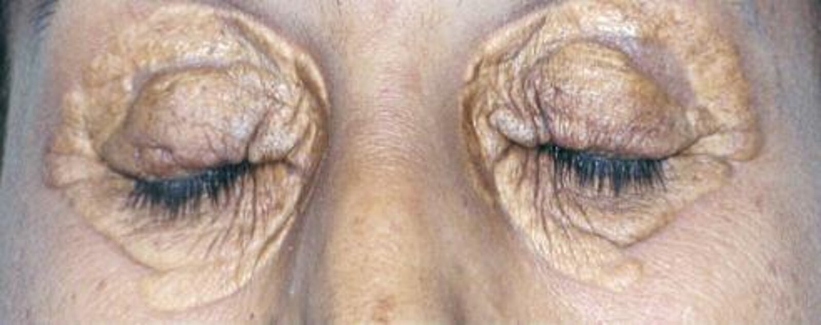 - Description: typically bilateral, yellow, flat plaques on the upper eyelids (nasal side)