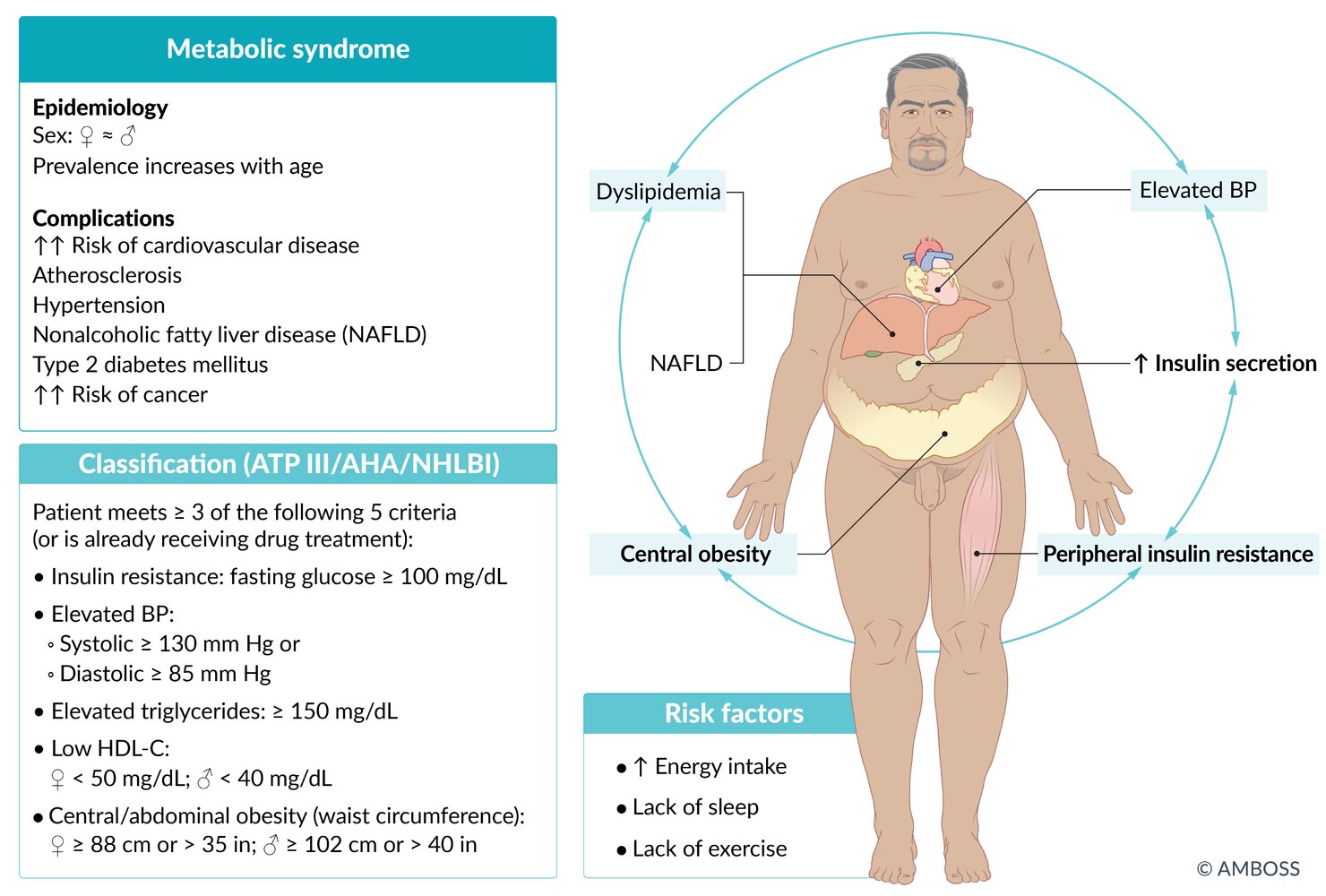 Metabolic syndrome is the co-occurrence of medical conditions that increase the risk for atherosclerotic cardiovascular disease (ASCVD) and type 2 diabetes: elevated blood glucose, hypertension, dyslipidemia, and/or abdominal obesity. Management of metabolic syndrome includes optimization of cardiovascular health (e.g., lifestyle modifications for ASCVD prevention) and treatment of the individual components of metabolic syndrome (e.g., management of hypertension and treatment of hyperlipidemia). Screening for the individual components of metabolic syndrome is recommended; the frequency and nature of screening varies based on risk factors. Cardiovascular-kidney-metabolic (CKM) syndrome is an emerging concept developed by the American Heart Association to describe the interaction between metabolic risk factors (e.g., obesity, diabetes, hypertension, hypertriglyceridemia), chronic kidney disease (CKD), and cardiovascular disease (CVD). Adverse social determinants of health (SDOH) are known to increase the risk for both metabolic syndrome and CKM syndrome and should be addressed as part of management.