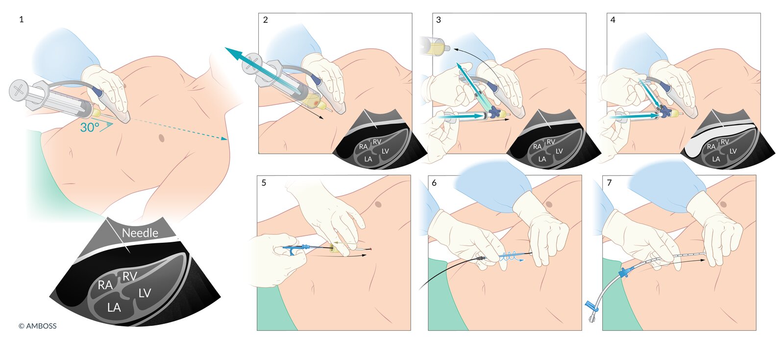 - Trajectory: Advance the needle over the rib border toward the pericardium.