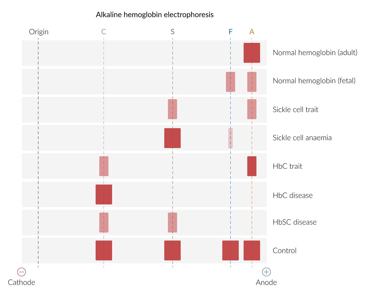 | Sickle cell trait | Sickle cell disease | Hemoglobin SC disease (HbSC) | Hb C carrier | Hb C disease | ||