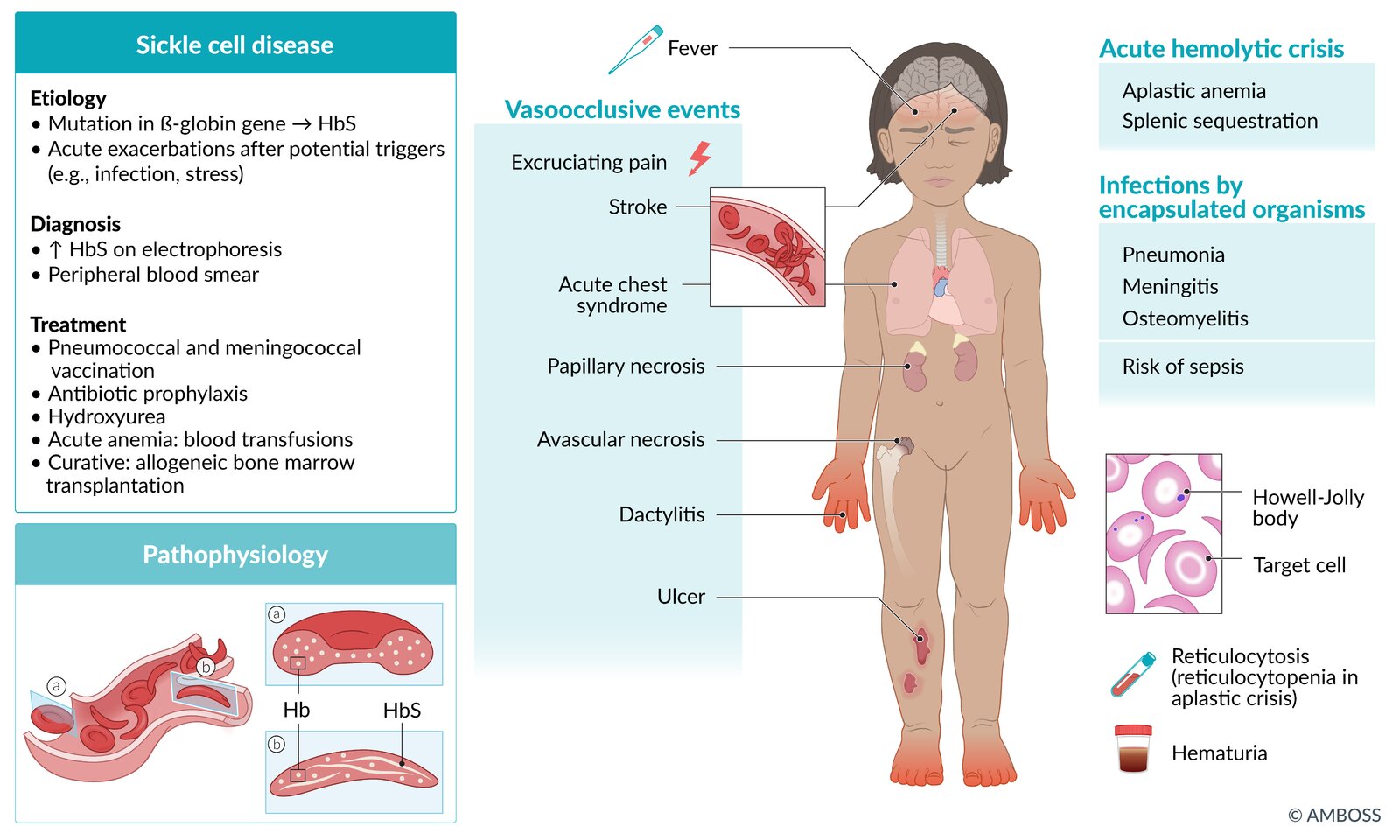 Sickle cell disease is caused by hereditary hemoglobinopathy, which includes sickle cell anemias (i.e., HbSS and HbSβ0thal) and other compound heterozygous genotypes (e.g., HbSC, HbSβ+thal). Mutations in the hemoglobin β chain lead to the formation of hemoglobin S, which polymerizes when deoxygenated. Deoxygenated HbS results in sickle-shaped erythrocytes that can occlude blood vessels and cause ischemia. Homozygous sickle cell anemia (HbSS) is the most common variant of sickle cell disease and occurs predominantly in individuals of African and Eastern Mediterranean descent, although people of any ethnicity can develop sickle cell disease. Screening for sickle cell disease is routinely recommended for all infants born in the United States. Hemoglobin separation studies (e.g., hemoglobin electrophoresis, high-performance liquid chromatography) and genetic studies are used to confirm the diagnosis. Complications can begin in early infancy and childhood and continue for the rest of the affected individual's lifetime. Acute complications include vascular occlusion events (e.g., vasoocclusive pain crisis, stroke, acute chest syndrome), severe anemia (e.g., sequestration, aplastic anemia), and invasive infections from encapsulated organisms (e.g., bacteremia, pneumonia, meningitis, osteomyelitis). Infants with confirmed sickle cell disease should receive antibiotic prophylaxis against invasive pneumococcal infection and all age-appropriate immunizations, and hydroxyurea therapy. Transfusion therapy (e.g., for vasoocclusive events, secondary prevention of stroke) and hydroxyurea are key aspects of decreasing morbidity and mortality. Screening for complications of sickle cell disease (including annual transcranial Doppler to screen for stroke risk from 2–16 years of age) should occur at regular intervals. Long-term complications include progressive loss of organ function (e.g., functional asplenia, cognitive decline, avascular osteonecrosis) secondary to repeated infarctions. Allogeneic bone marrow transplantation is currently the only curative treatment option.